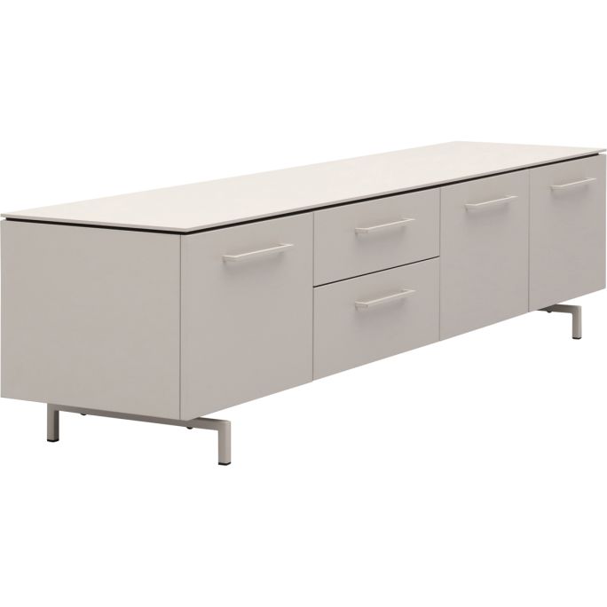 Ontdek Senna – een ruim en modern tv-meubel met afmetingen van 211x50x45 cm en in een zachte ivoortint. Met twee lades en drie softclose deuren berg je moeiteloos spullen op zonder herrie. Het tv-meubel is gemaakt van sterke en onderhoudsvriendelijke melamine en staat op stoere metalen poten voor een moderne uitstraling. Perfect voor een georganiseerde en eigentijdse woonruimte!